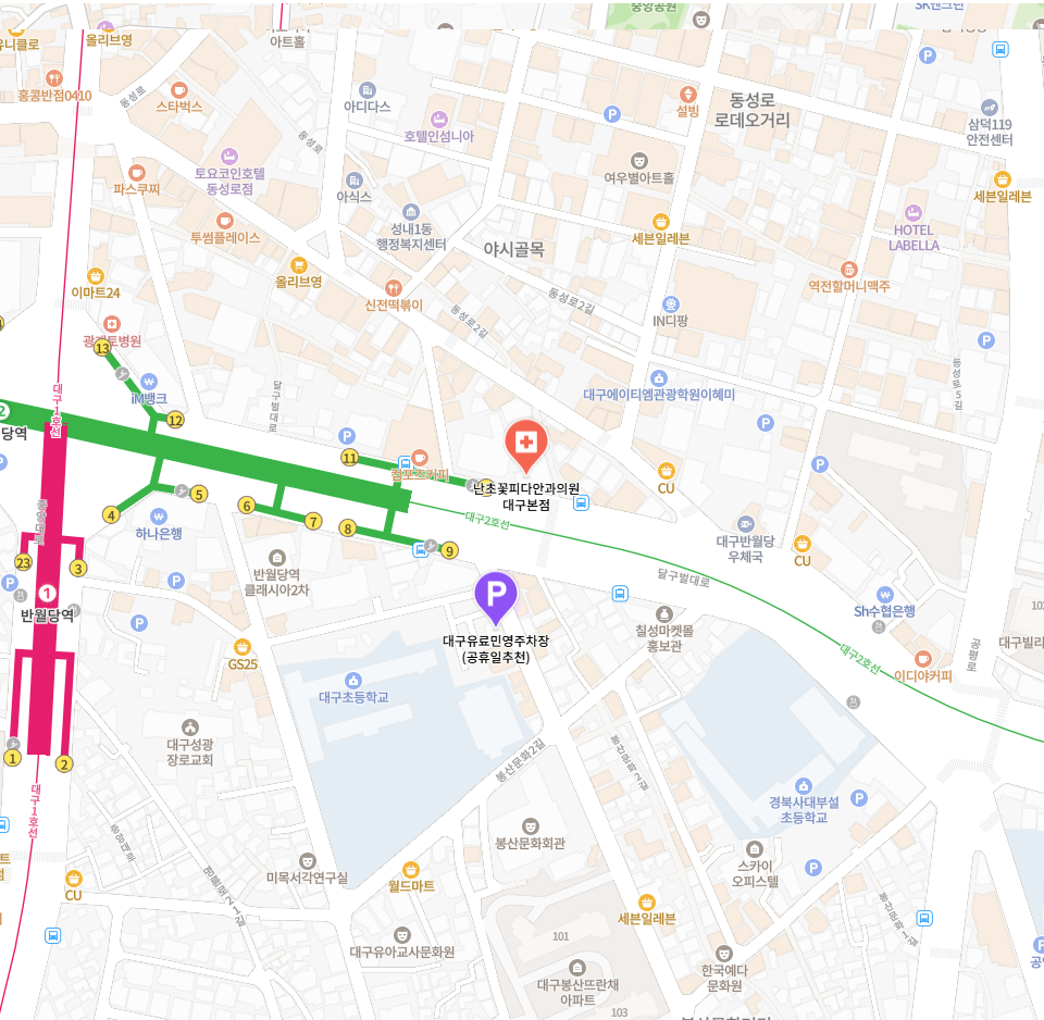 건물 내 주차타워 및 봉산문화거리 입구 대구유료민영주차장(공휴일추천) 이용가능
